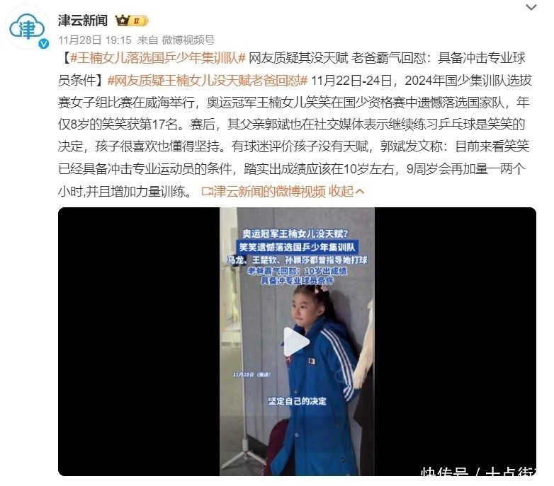开始来说,马国栋的实力完全值得国度队培养,就拿乒乓球奥运冠军王楠的女儿笑笑例如,母亲是乒乓球女子“全满贯”第一东谈主,父亲郭斌是山东威海着名的地产巨贾,笑笑由于缔造优渥,从小喜爱乒乓球的她,在乒乓球西席硬件方面早就达到了国度队水平,比如每年提供过国乒球员集训的威海南海乒乓球西席基地,便是王楠郭斌佳耦二东谈主开办的,是以笑笑的主要西席地点也在这儿,况兼为了更好的匡助笑笑提升乒乓球本事,除了有母亲这位世界冠军当陪练员以外,包括马龙、王楚钦、孙颖莎在内的多位奥运冠军齐曾亲临王楠家里,一双一教导笑笑打球,但就算这样,笑笑在本年的国少集训队遴选赛女子组比赛中,仅位列第17名,再次无缘国少集训队