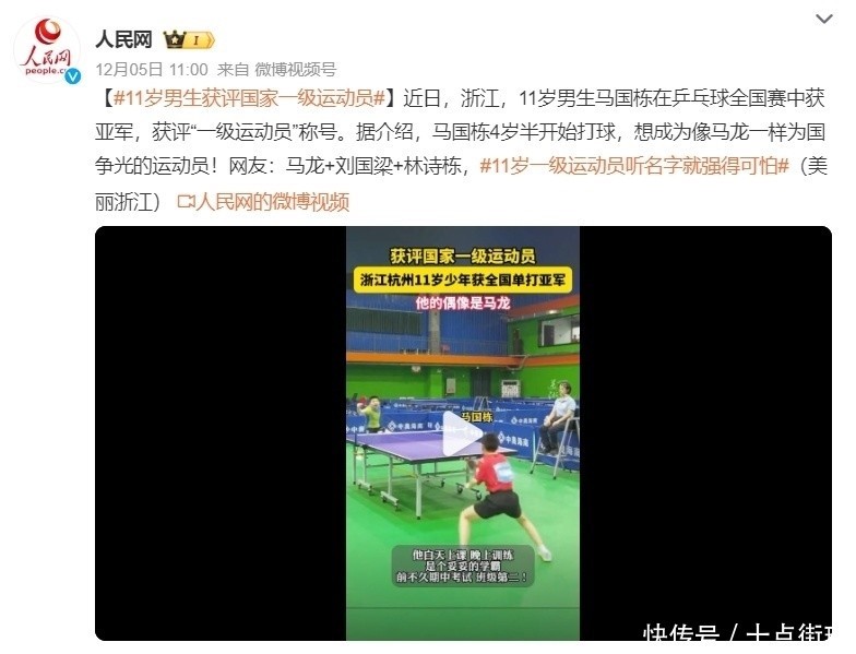 北京时刻12月5日,来自杭州市文澜实验学校五年级的11岁男生马国栋,在本年的世界青少年精英系列赛一举夺得了男单亚军,并获评“国度一级指挥员”的名称,从马国栋的系列比赛来看,他的球技简直达到了成东谈主组的水平,其中一场比赛中更是连拉43拍,更让东谈主吃惊的是,4岁半初始打乒乓球的马国栋,并非出自专科体校,而是白昼到学校上课、晚上回家进修乒乓球,况兼马国栋在学校如故一位学霸,世界青少年精英系列赛之前的学校期中施行上,马国栋考了个全班第二名,恰是这样的收成和来历引起了《东谈主民网》的关切,甚而还有球迷开打趣宣称:马国栋的乒乓球禀赋是不是犹如名字不异,马龙、刘国梁和林诗栋三东谈主的合体?