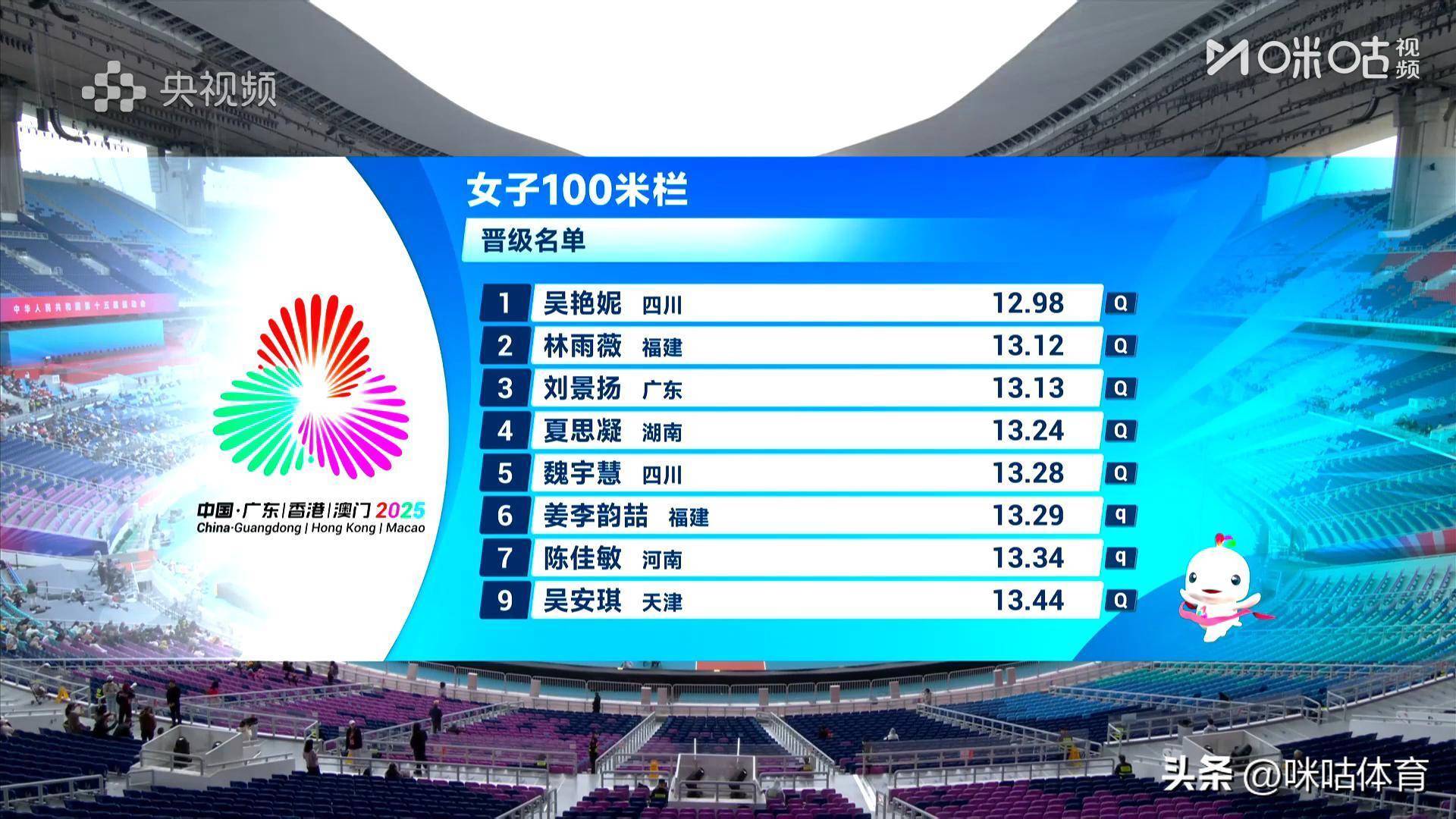 福建队林雨薇13秒12,广东队刘景扬13秒13,湖南队夏想凝13秒24,均告成晋级。